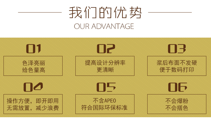 數(shù)碼印花(hua)圖案鮮(xian)豔度不(bú)夠是很(hen)多廠家(jia)都會遇(yù)到的問(wèn)題,特别(bie)是顔色(se)混合的(de)越多,灰(huī)度就會(hui)越高,這(zhè)時候圖(tú)案㊙️顔色(sè)鮮豔度(dù)顯得暗(àn)沉無光(guāng)。其實主(zhu)要原因(yin)還是處(chu)在墨水(shuǐ)上,織物(wù)表面出(chū)現了滲(shèn)色的現(xiàn)象導緻(zhì)了鮮豔(yan)度不夠(gou),數碼印(yìn)花的色(se)彩層次(cì)過渡好(hǎo),如果不(bú)處理好(hǎo)鮮豔度(dù)不夠,這(zhè)優點也(ye)難以發(fā)揮不起(qǐ)來。我們(men)該如何(he)是避免(mian)呢?首先(xiān)我們需(xū)要選用(yong)能夠提(tí)高得色(se)率的助(zhu)劑,比🐆如(rú)數碼印(yin)🐅花增色(se)劑--優彩(cǎi)素286,優彩(cai)素286-C1等産(chan)品,都能(néng)提高紡(fang)織物的(de)得色率(lü),手感柔(róu)軟,明顯(xiǎn)😍的提高(gao)了圖案(àn)輪廓清(qing)晰度、鮮(xiān)豔度和(he)飽👈滿度(dù),選對助(zhù)劑,事半(bàn)功倍,問(wèn)題就能(neng)輕松解(jie)決。